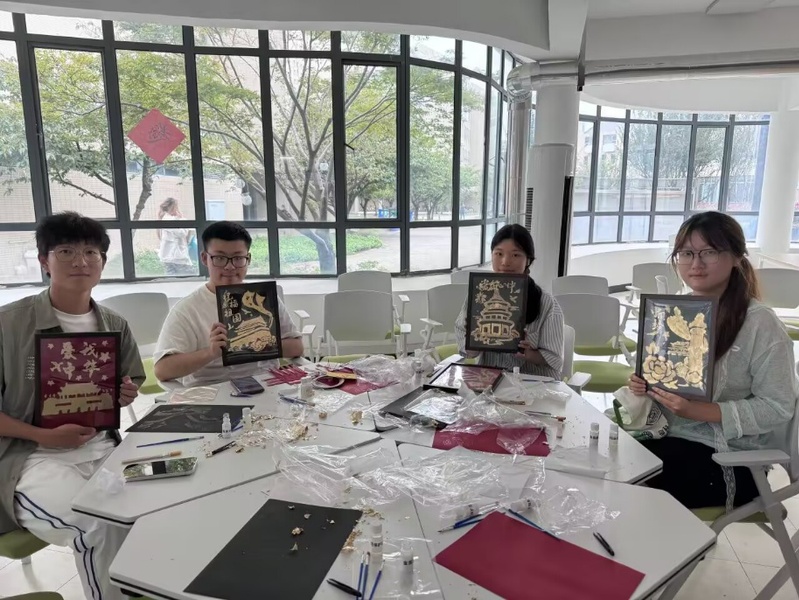活动现场,为师生贴心准备了金箔画与竹编风铃两种独具创意的手工项目。活动伊始,大家领取材料后便迅速投入创作:有的巧手细心贴饰金箔,以流光溢彩的图案勾勒出盛世气象;有的则精心组装竹片与铃铛,将声声祝福编织进一个个诗意盎然的风铃之中。现场氛围轻松而专注,一件件独具匠心的作品在同学们的巧思与协作中渐次成型。