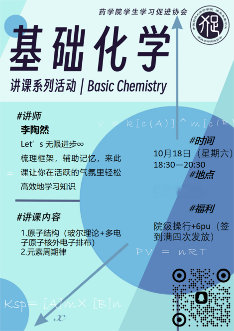 为助力社区同学攻克基础化学知识难点,10月18日18:30-20:30,药学院学生学习促进协会在文昌苑·观澜社区开展基础化学讲课系列活动。受邀老师李陶然以“梳理框架,辅助记忆”为核心,从原子结构和元素周期律两大模块入手,引导同学们轻松高效掌握各类知识要点,现场气氛热烈。