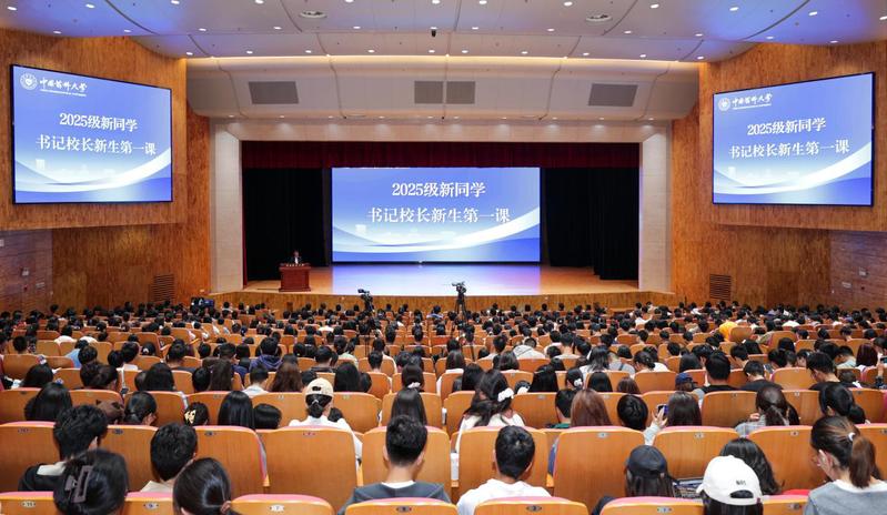 10月18日上午,校长郝海平在江宁校区会议中心大礼堂为2025级全体新生讲授“新生第一课”,全校另设31个分会场同步直播。校党委副书记朱红主持大课。有关职能部门负责同志、各学院分管学生工作党委副书记、新生辅导员参加大课。