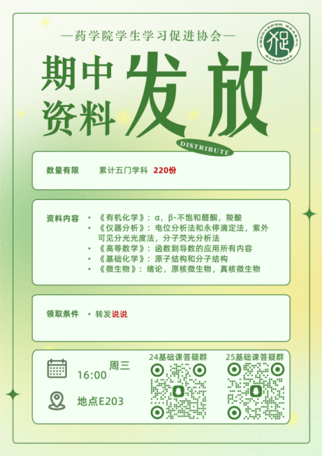 药学院学生学习促进协会在文昌苑·观澜社区开展期中资料发放活动,涵盖有机化学、分析化学、高等数学、基础化学、微生物五门学科共220份资料。