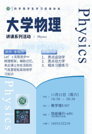 药学院学生学习促进协会以“梳理框架,辅助记忆”为核心,在文昌苑·观澜社区开展基础化学讲课系列活动,围绕质点运动学、质点动力学两大板块进行课程内容梳理,引导同学们轻松高效掌握知识,深化对基础化学重点内容的理解。