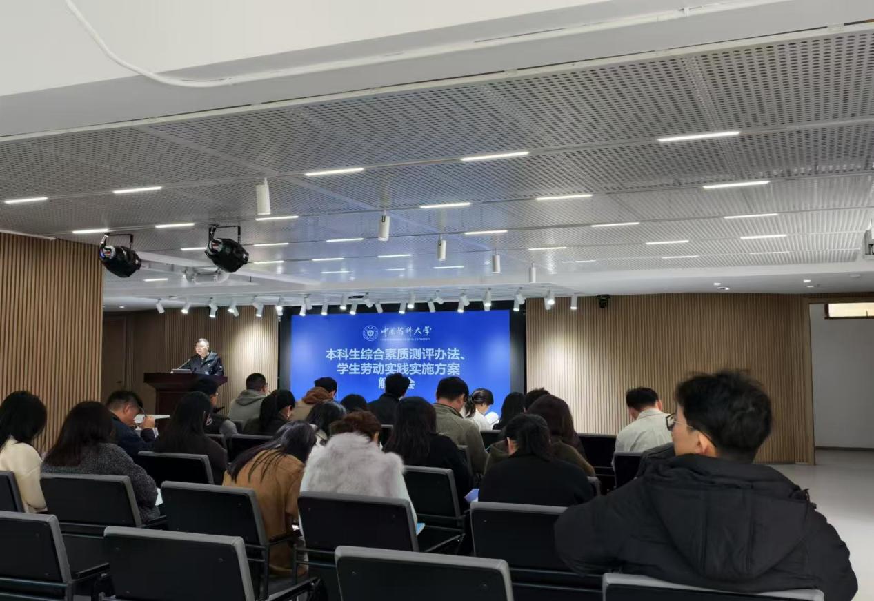 3月27日,我校在江宁校区文菁苑·孟目的书院开展《中国药科大学本科生综合素质测评办法》等文件解读会。学工处副处长卢献锁、相关工作人员和全体本科生辅导员参加活动。